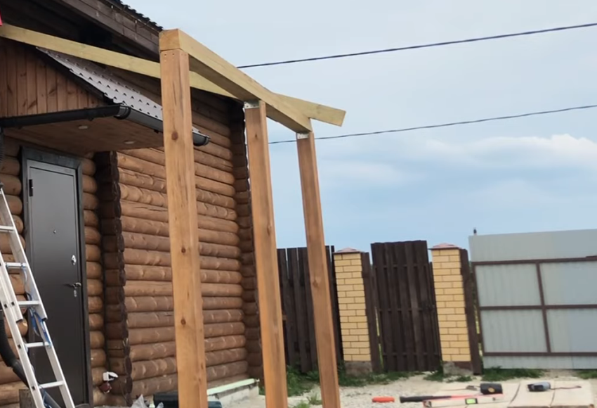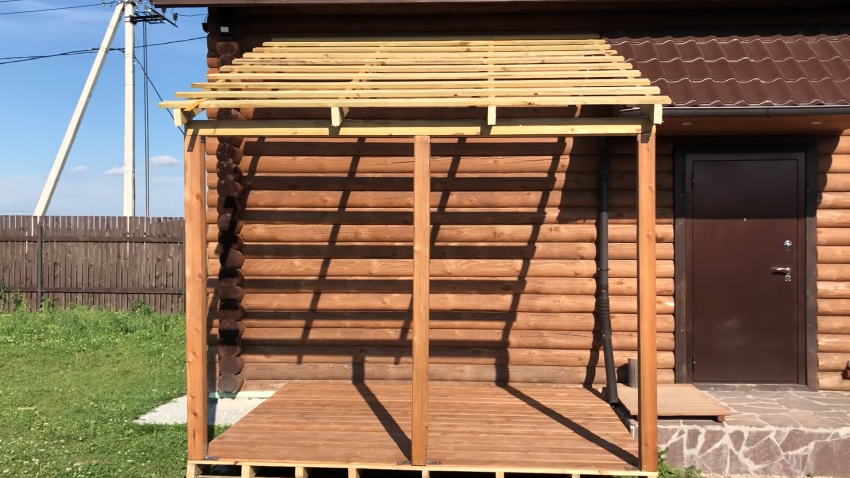 Приступаем к созданию навеса. Для работы используют деревянные лаги. Фиксируем их при помощи металлических уголков и саморезов к основанию террасы. Верхняя часть навеса должна плавно переходить в крышу помещения.
