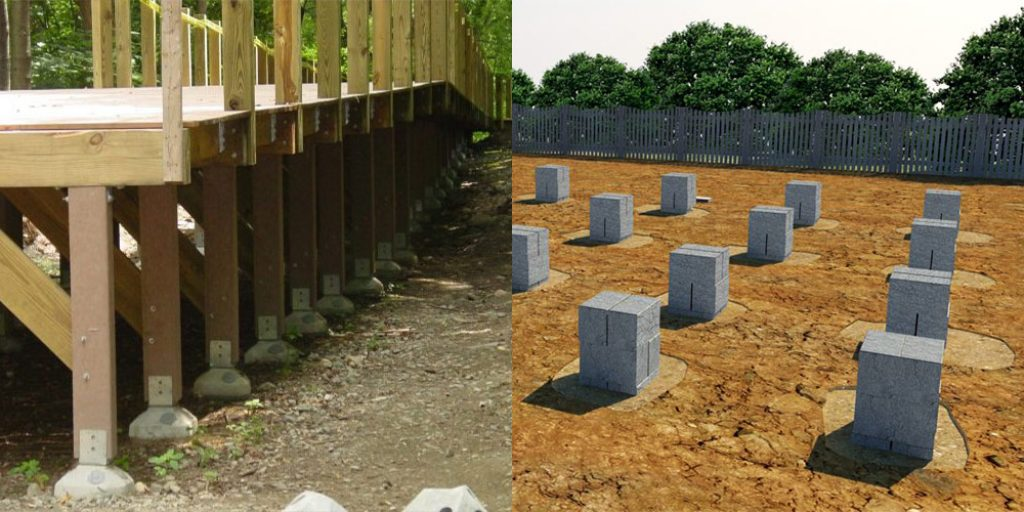 При строительстве фундамента террасы учитывайте, что он держит всю конструкцию террасы и предотвращает ее сдвиг или уход в землю. Обычно это бетонные блоки размером 30 х 30 см, заглубленные на 15 см в нетронутый плотный грунт.
