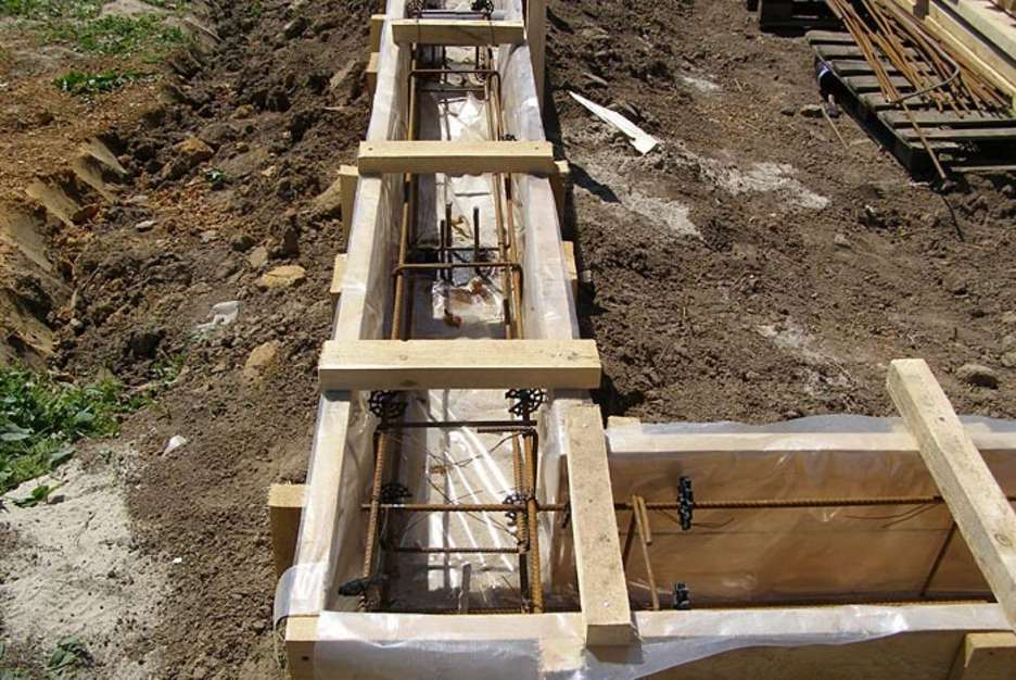 Сделайте опалубку высотой 30 см. Если вы не монтируете деревянную конструкцию вглубь, выложите доски по линиям траншеи. Выровняйте окоп строго по этим доскам.