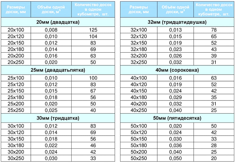 | Размер (мм) | м2 в 1 м3 | Штук досок в 1 м3 | Объем одной доски (в «кубах») |