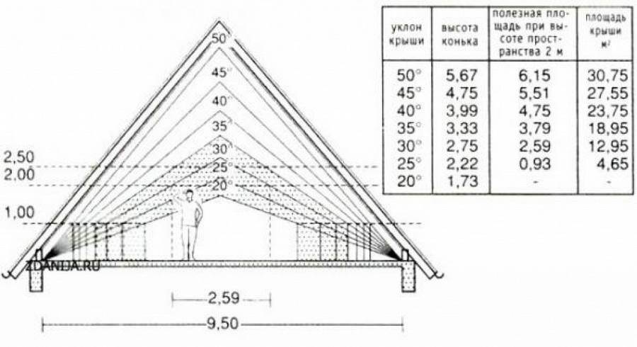 Высота конька определяется углом ската крыши, поэтому для вычислений в первую очередь необходимо знать этот параметр, который зависит от нескольких факторов. Во-первых, угол ската определяет экономичность кровельной системы – чем меньше угол, тем меньше кровельного материала уйдет на покрытие крыши, а следовательно, меньше затрат во время строительства.
