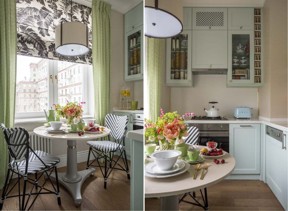 В такую кухню естественно впишется светлый деревенский гарнитур с открытыми полками и декоративными фасадами. Для украшения используй декупаж, роспись, цветочные и растительные мотивы. А лучшими аксессуарами станет твоя же кухонная утварь: декоративные сервизы, чугунные котелки, глиняные горшочки, баночки со специями.