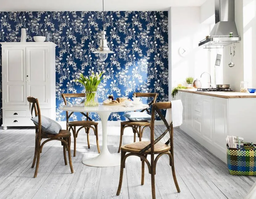 Существует немало способов сделать акцент на той или иной детали, а стена, оклеенная обоями, всегда будет оставаться в центре внимания. Если вы решили создать акцентную стену, не забывайте про влияние узора на восприятие. Полотно с мелким рисунком заставит комнату выглядеть просторнее; крупный принт создаст иллюзию уменьшения пространства.