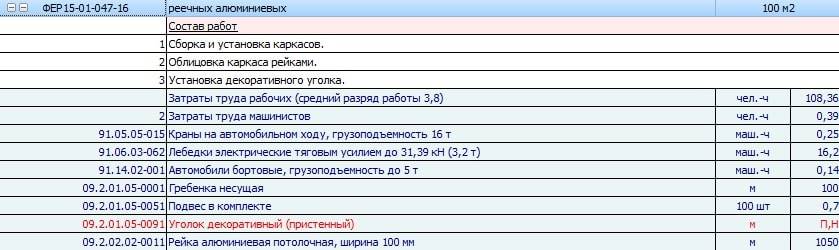 В качестве расценки в смете на монтаж потолка «Грильято» можно использовать норму под шифром ФЕР15-01-047-16, представленную на рисунке 4. Как видно из иллюстрации, ФЕР15-01-047-16 учитывает в себе расценку в смете на реечный потолок из алюминия. Измеряется объем работ по площади потолка, а в состав работ данной нормы входят помимо собственно расценки в смете на устройство потолка «Грильято» еще и расценки на сборку и установку каркасов, а также работы по установке декоративного уголка.