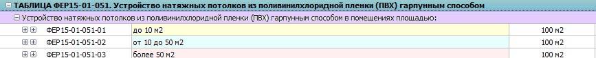 Как видно на рисунке 3, таблица ФЕР15-01-051 имеет в своем составе три расценки в смете на устройство натяжных потолков, каждая из которых рассчитана на определенную площадь помещения. Так, норма под шифром ФЕР15-01-051-01 предусматривает устройство натяжных потолков в помещениях площадью до 10м2, норма ФЕР15-01-051-02 может быть использована в смете на устройство натяжных потолков площадью от 10 до 50 м2, а норма ФЕР15-01-051-03 пригодится для площади более 50м2.