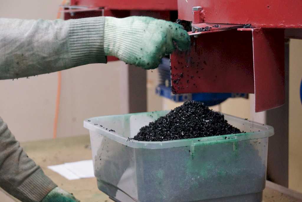 - Кусочки резины измельчаются до тех пор, пока они не достигнут желаемого размера и однородности.