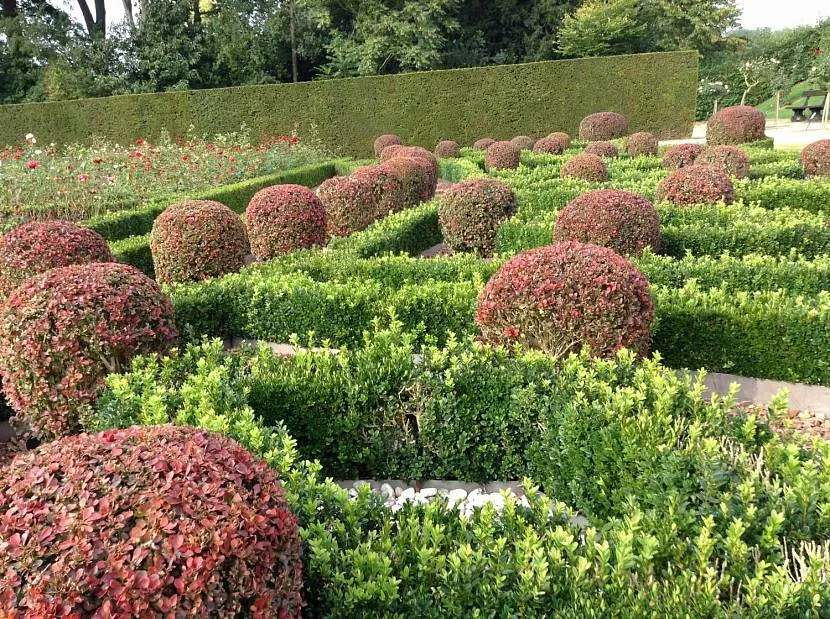 Фигурный бордюр из самшита хорошо сочетается с остриженным барбарисомИсточник Pinterest