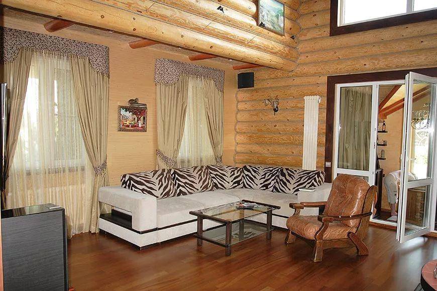 - Стены в гостиной и спальнях нужно отшлифовать и покрыть прозрачной пропиткой или матовым лаком, которые не изменят их цвет, но позволят подчеркнуть естественную фактуру натурального дерева;