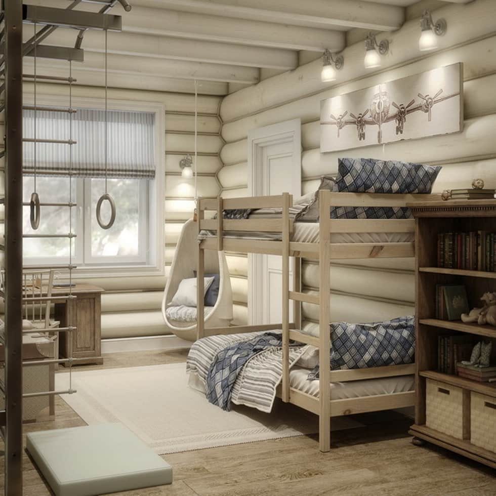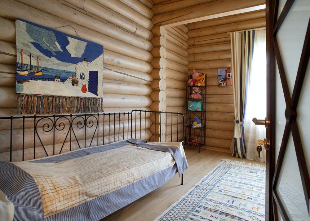 Важно! Обязательно обращайте внимание на стены: если они натуральные, то есть дерево не спрятано за гипсокартоном, то и текстиль следует подбирать соответствующий. 15
