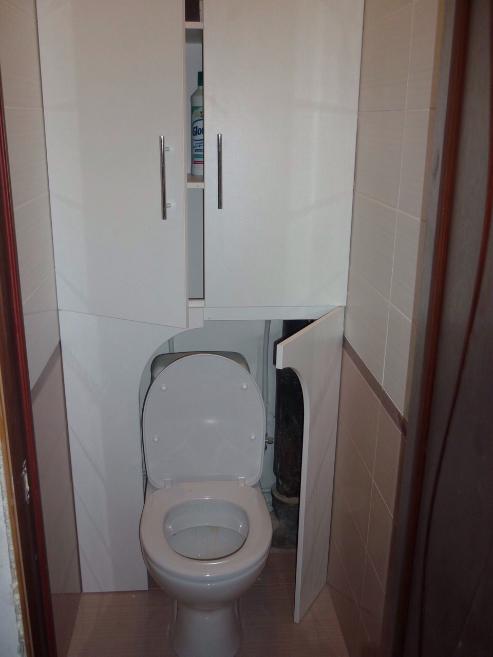 Если за унитазом располагаются трубы, то их можно спрятать внутри встроенного шкафа. Вернее шкафчик организуется внутри короба из листового материала – ДСП, фанеры, ГКЛВ. Стоимость такого шкафа в итоге будет меньше, а эстетическая составляющая лучше – помещение будет казаться просторным, свободным от мебели. И каркас, и фасад такого шкафа под силу изготовить даже новичку: нишу потребуется оборудовать только полками и дверцами.