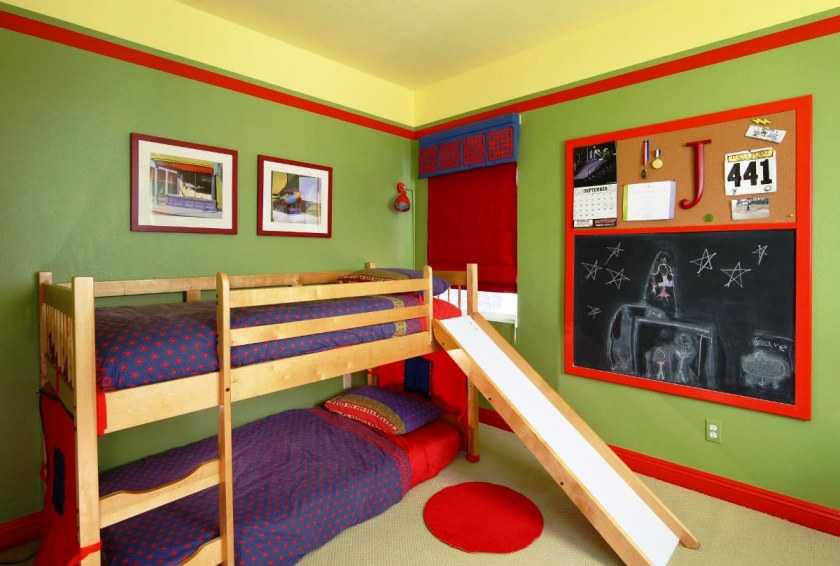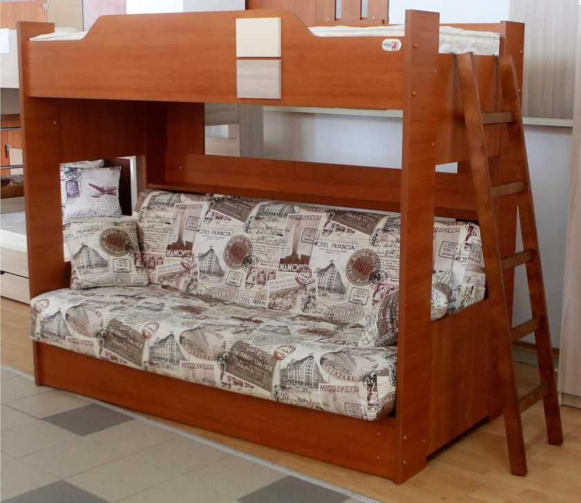 Двухъярусная детская кровать с диваном может стать хорошим вариантом. В диване или в специальных ящиках хранятся вещи и постельное белье. Также под нижним ярусом размещается ящик с игрушками. Из нижнего яруса оборудуется зона для игр.