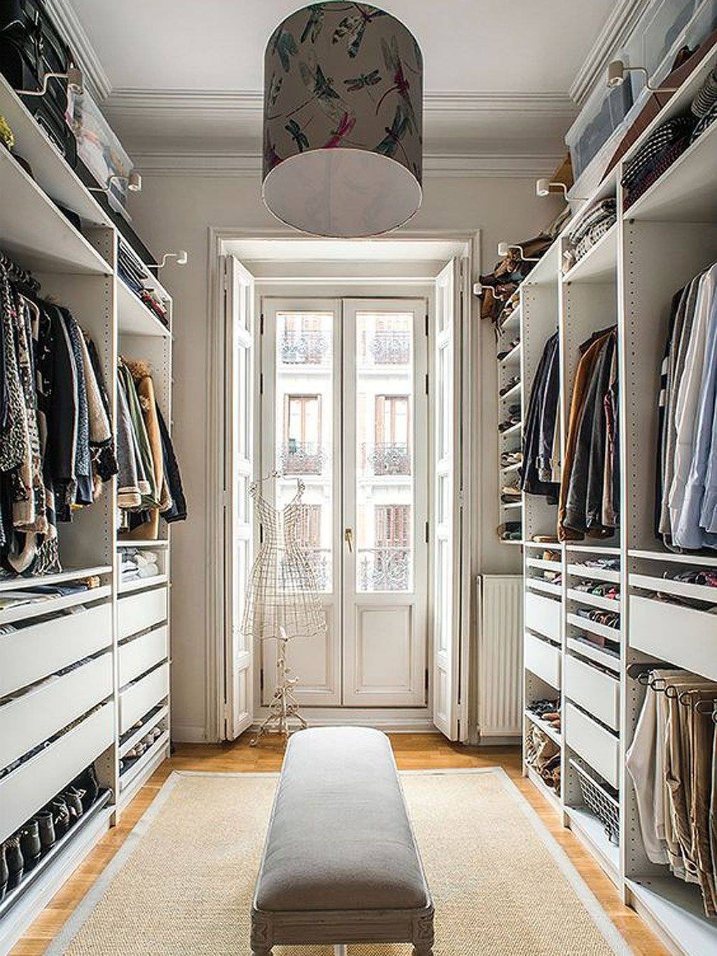 Шкафы в квартире необязательно должны быть линейными. Если позволяет планировка, расположите их П-образно в мини-кладовой 2 на 2. Получите уютную вместительную примерочную.