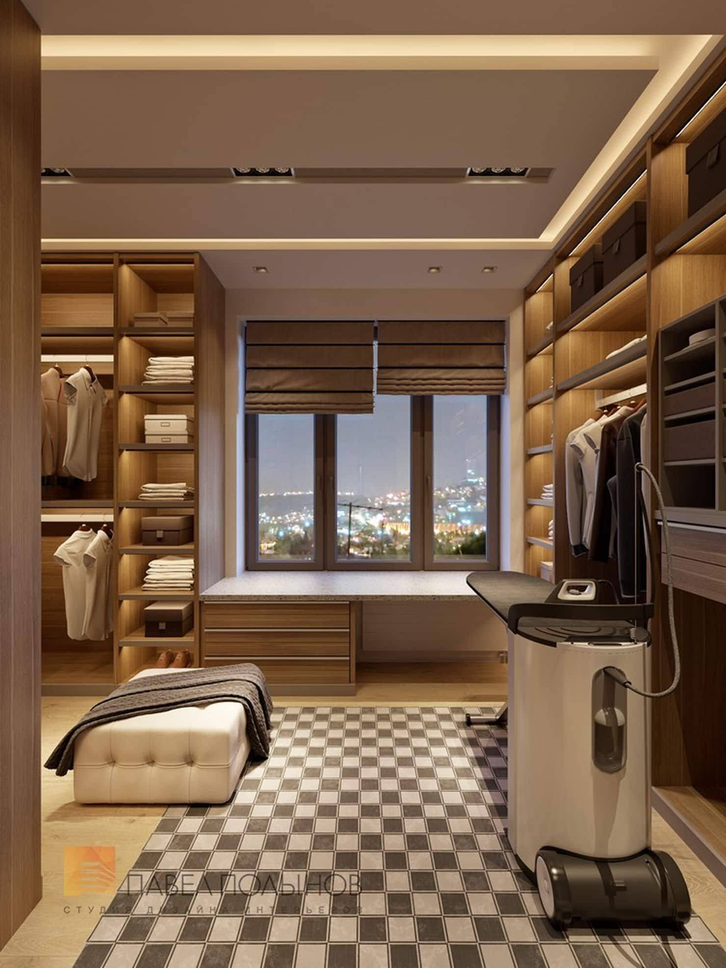 Всё необходимое можно легко найти в гардеробной: полки или стеллажи удобно расположились вдоль стен, вешалки на мощных штангах можно свободно перемещать, выбирая костюм, пальто или куртку.