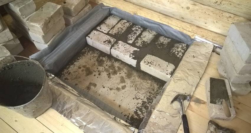 - обустраивается огнезащитное основание – например, это может быть слой кирпича, или армированная стяжка, или асбесткартон, поверх закрытый стальным листом толщиной не менее 1 мм.