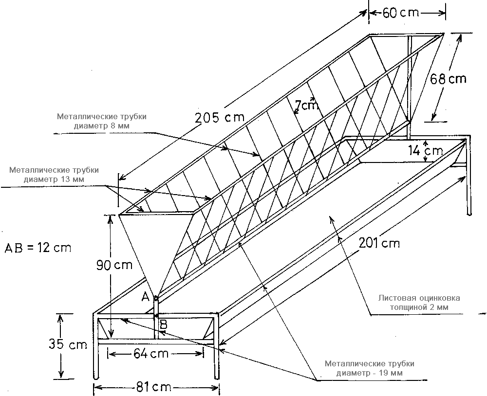 - Приварите сварочным аппаратом 4 стальных листа – 2 по ширине, 2 по длине, но так, чтобы получился конус. В нижней части оставьте щель для подачи сена или другого корма. Учтите, что продукты не должны застревать в разрезе и слишком сильно пересыпаться. Поэтому угол соединения с 2-х сторон составляет от 15 до 18°.