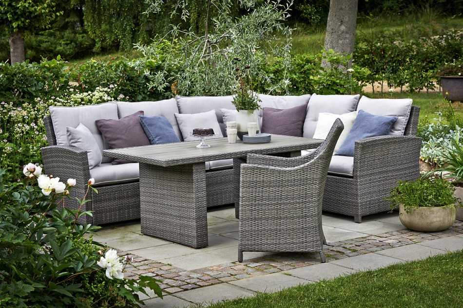 - мебель следует подбирать исходя из общего стилевого оформления участка. Это могут быть плетёные или складные комплекты, а также изделия из пластика. В последнее время часто используют мебель из ротанга, дерева или кованые предметы.
