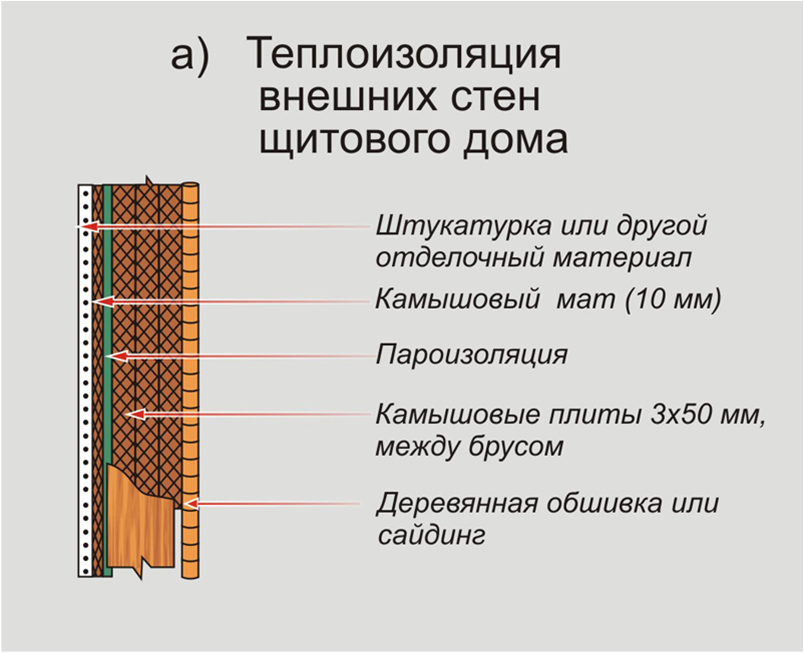 - заполнение каркаса стен плитами, крепящимися к древесине гвоздями, или снопами камыша диаметром 120-180 мм с последующей фиксацией прижимными досками для качественного уплотнения. При применении двухслойного заполнения волокна матов необходимо располагать в разных направлениях;