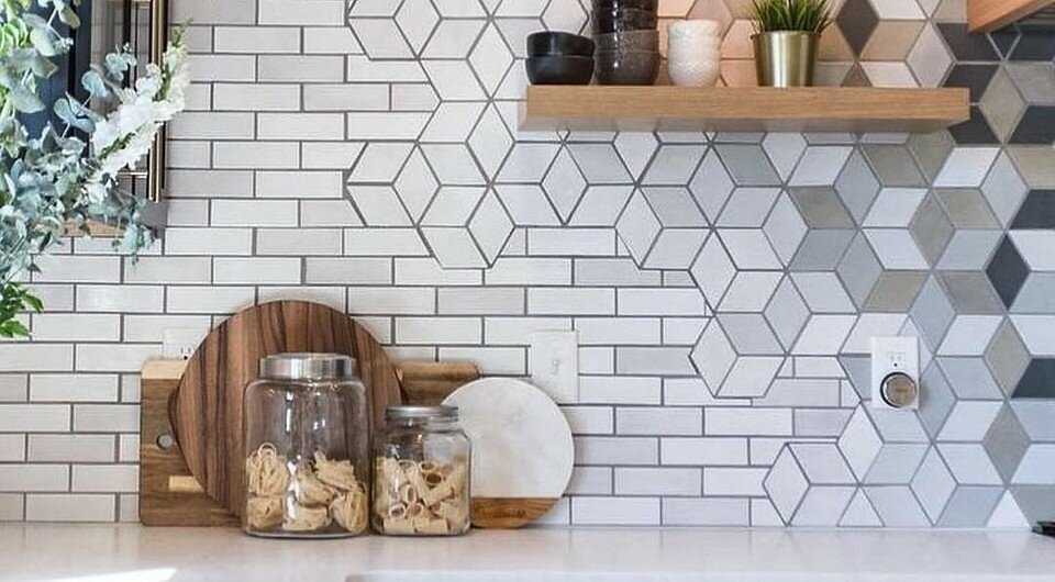 - Интересная плитка в виде чешуи, сот или нестандартно уложенный кабанчик.