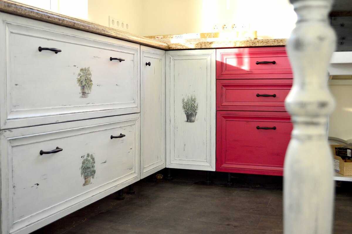 Если старая кухня технически вполне пригодна для дальнейшей эксплуатации, то в качестве переделки можно просто освежить фасады при помощи окрашивания. Специалисты рекомендуют выбирать автоэмаль, устойчивую к механическим повреждениям, не боящуюся влаги, солнечных лучей и перепада температур. Можно также взять акриловую или алкидную краску, но срок ее действия гораздо меньше. Перед началом переделки необходимо снять фасады, пронумеровать их (для дальнейшего удобства при сборке) и открутить фурнитуру. Ручки, петли, рекомендуется подержать в растворе воды и соды, а затем протереть растворителем.