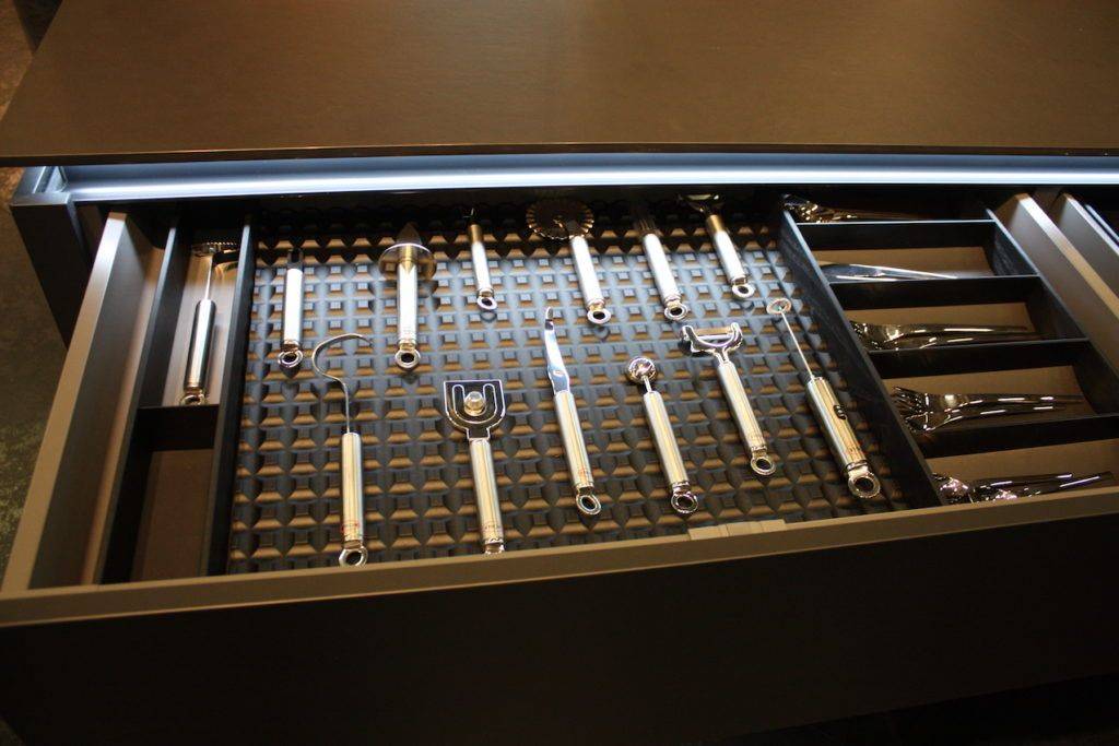 Наряду с большим количеством ящиков, домовладельцы, выбирающие дома, также выбирают все более организованных ящиков. Даже обычные шкафы теперь открываются, чтобы открыть выдвижные полки, которые очень похожи на выдвижные ящики, потому что они более функциональны и проще в использовании, чем большие, открытые шкафы. Новые конструкции включают светодиодное освещение, которое освещает содержимое, что позволяет быстро найти необходимые инструменты. Лучшее разделение и специализированное хранение таких вещей, как ножи и столовые приборы, также становятся обычным явлением. Получение кухонных принадлежностей без прилавка и в хорошо организованных ящиках помогает сохранить пространство без помех, гладкий и шикарный.