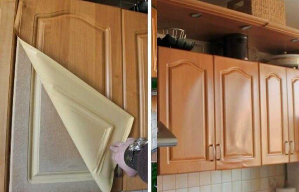 Виниловая пленка – простой и бюджетный вариант переделки кухни, старая поверхность которой может быть как деревянной, так и пластиковой: самоклейка подойдет в обоих случаях. Перед тем как начинать переделку мебели, необходимо заранее замерить размеры фасадов и приобрести пленку с запасом, чтобы была возможность исправить возможные ошибки.