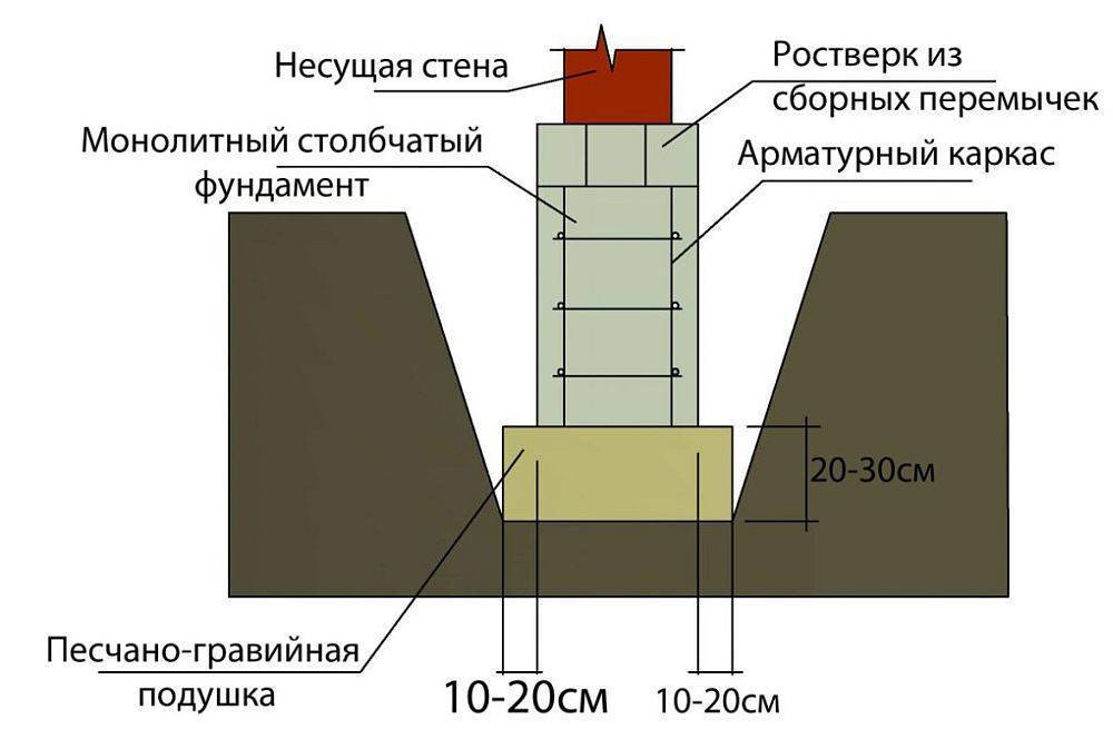 Уширенная подошва столба позволяет снизить нагрузку на грунт при слабых грунтах