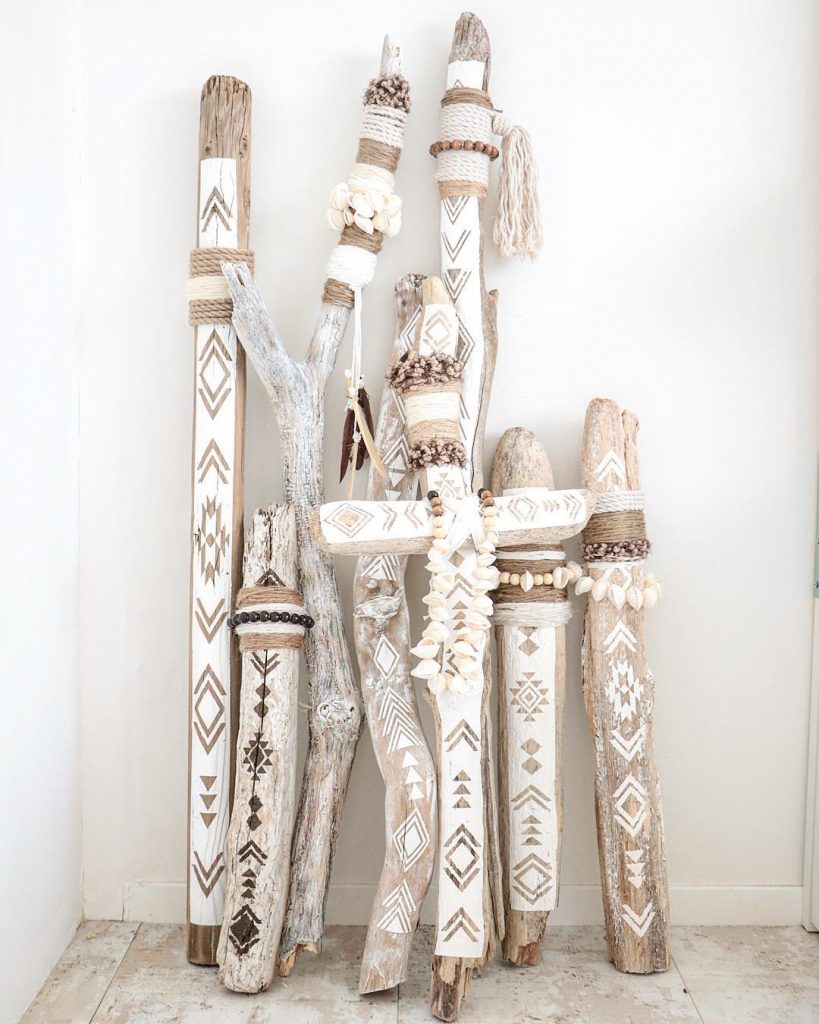 Еще одна необычная композиция выполняется из деревянных веток разной величины. Элементы крепятся на прочную основу.