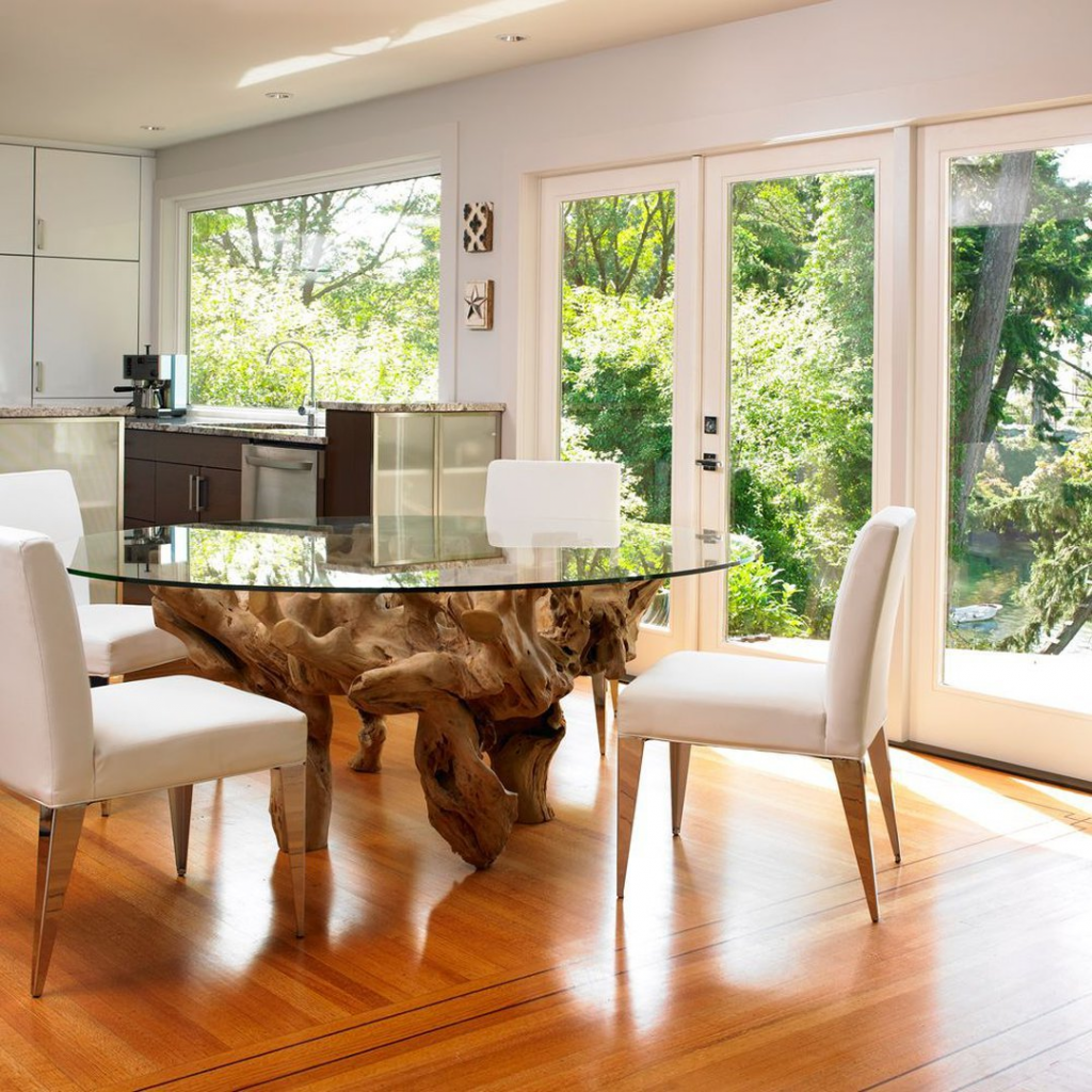 Закрепите столешницу на срезе крупной коряги, и ваш рустикальный дизайн будет безупречен