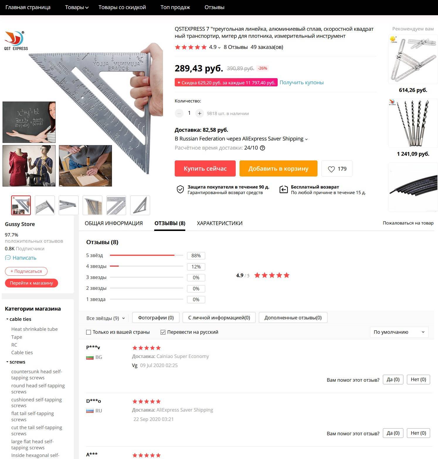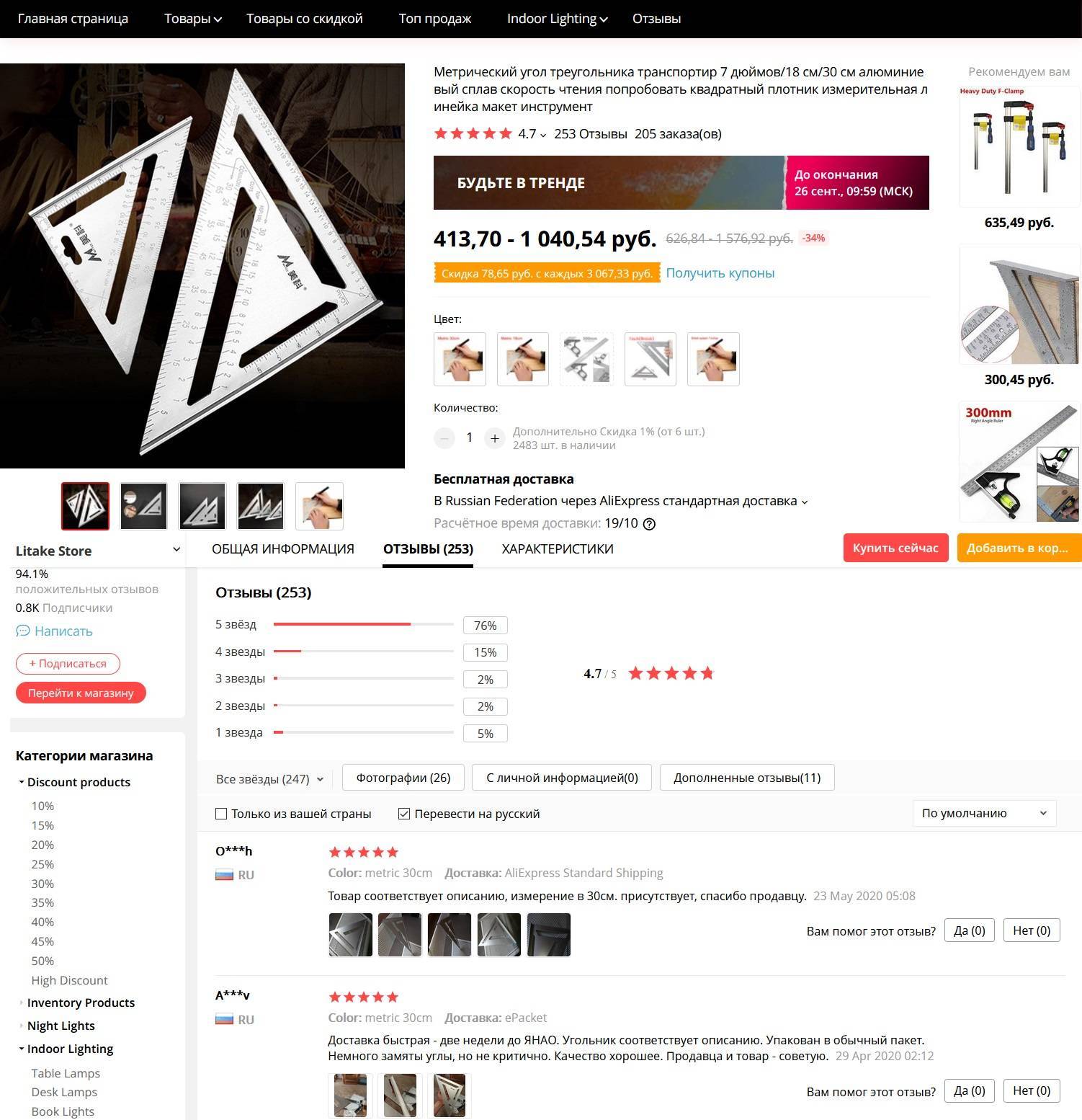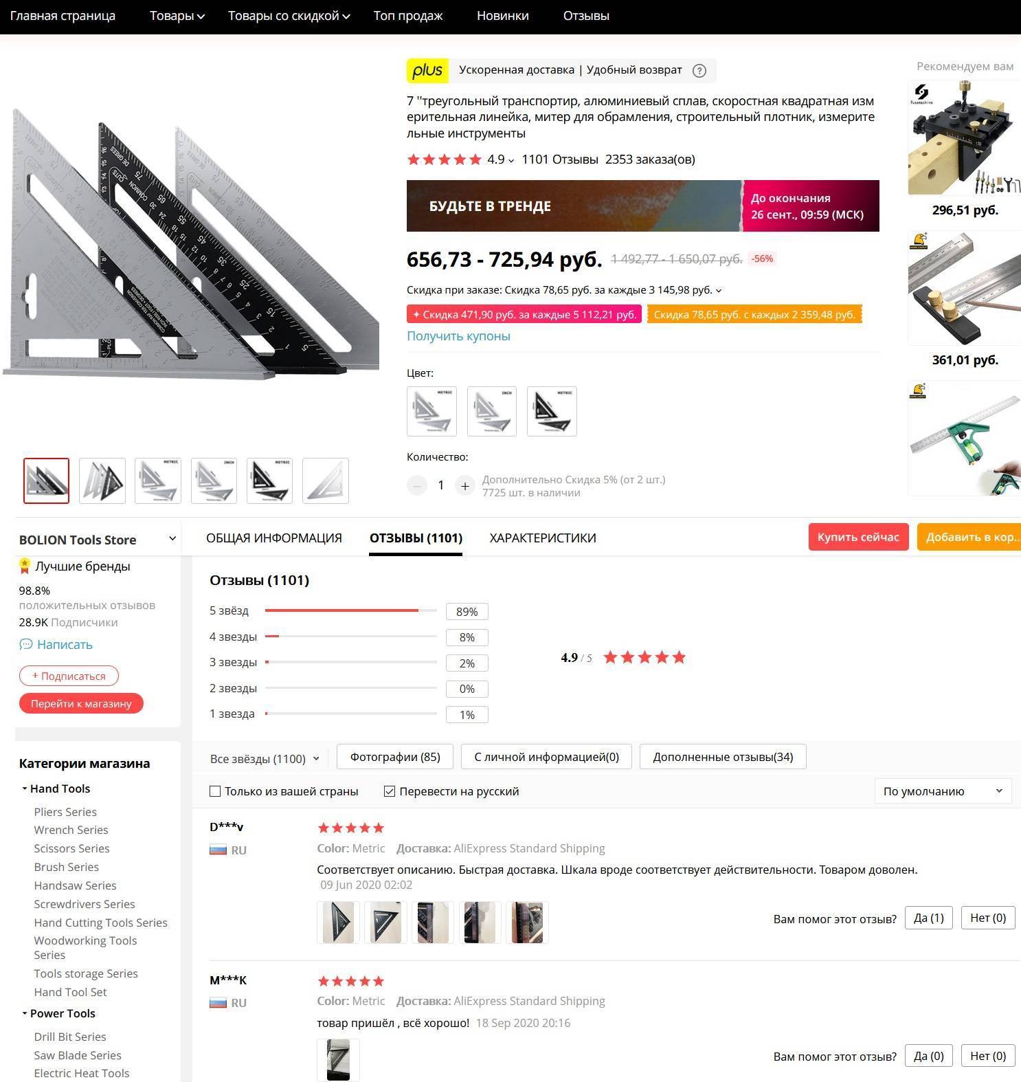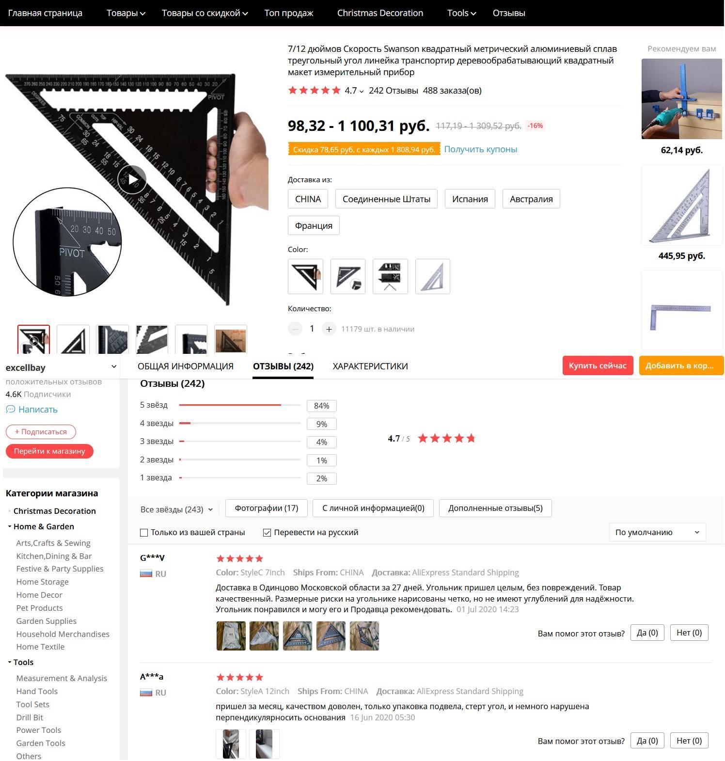 Как предупреждает продавец, при измерении могут быть небольшие погрешности размером в 1-3 см, которые обусловлены ручным фиксированием. Из представленных моделей можно выбрать классический вариант угольника свенсона, угольник со специальным упором, вариант с серебряным покрытием угольника и расширенную версию с размерами 215мм/62мм.