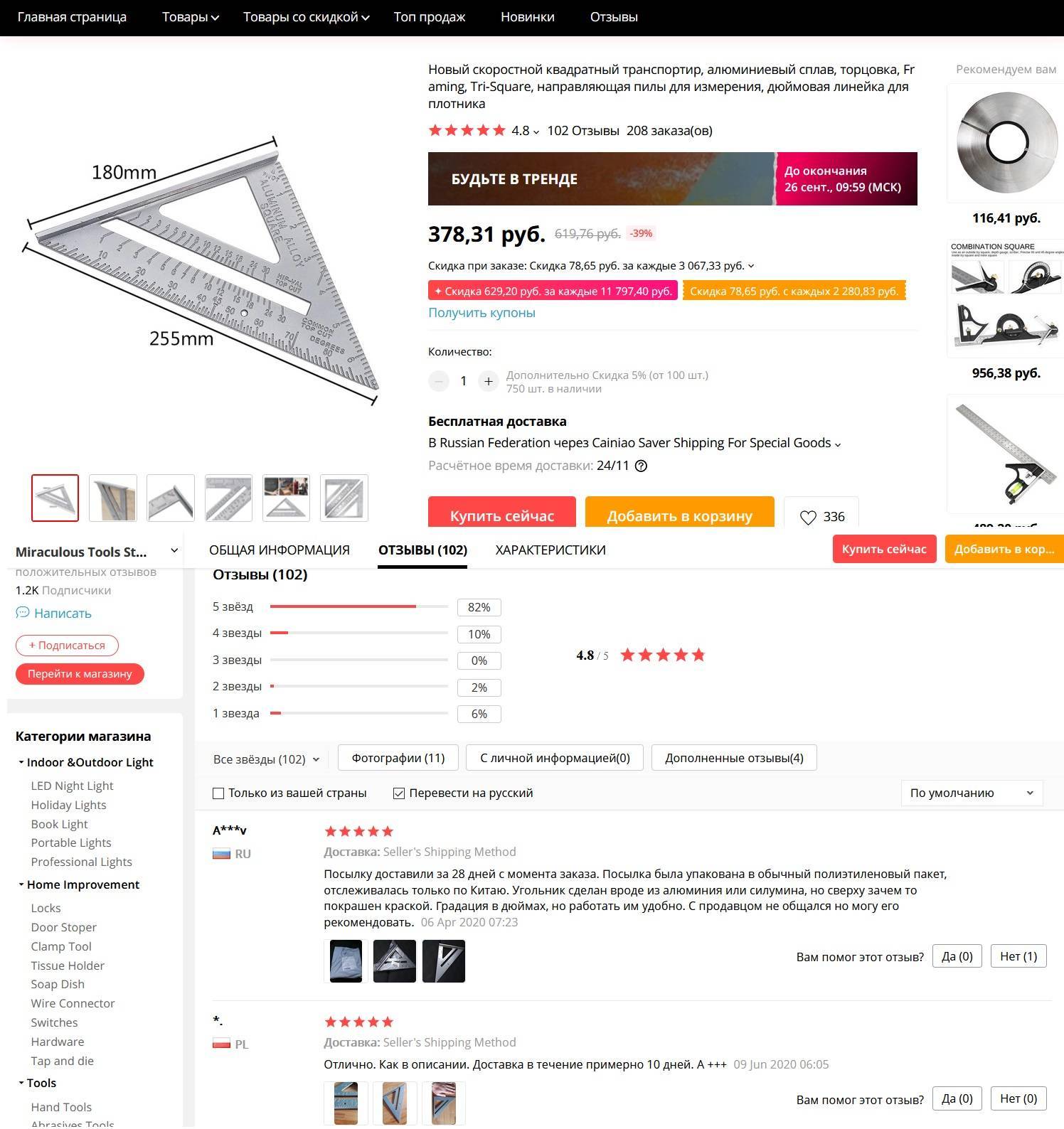 Данное изделие, по заявлению продавца, обладает такими характеристиками, как долговечность и высокая прочность. Также линейка толще на 30% в сравнении с другими угольниками, которые можно найти на сайте Алиэкспресс. Она устойчива к поражению коррозией. Надпись на измерительный инструмент нанесена специальным лазером.