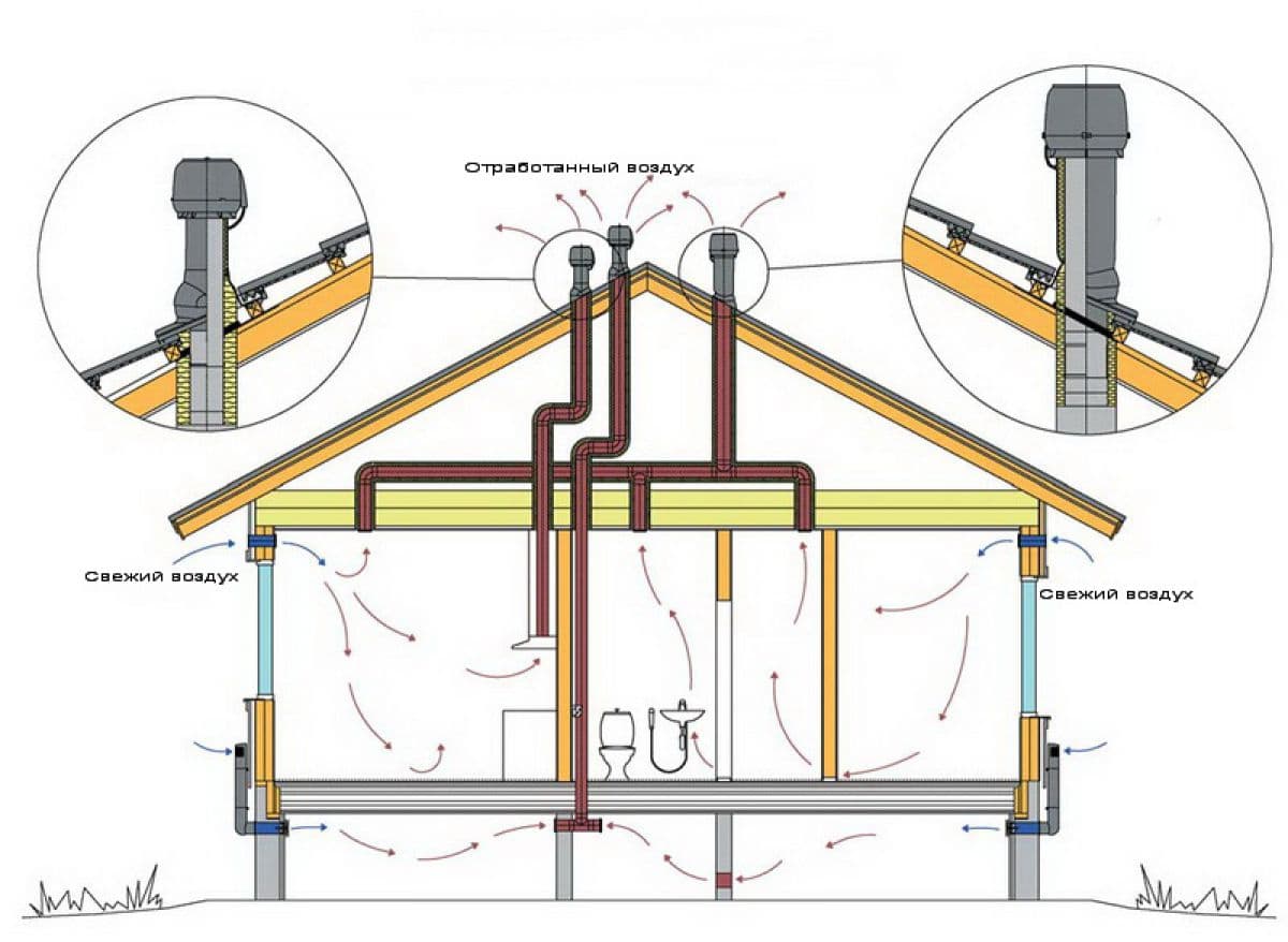 Для повышения эффективности естественной системы в каналы устанавливают вентиляторы, которые автоматически включаются при повышении влажности. Намного выгоднее использовать принудительные системы вентилирования. Они работают с использованием приточных и вытяжных вентиляторов. Установка способна очищать и подогревать подаваемые в дом воздушные массы.