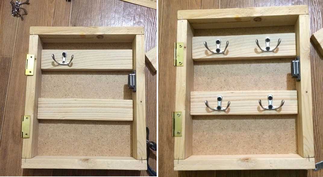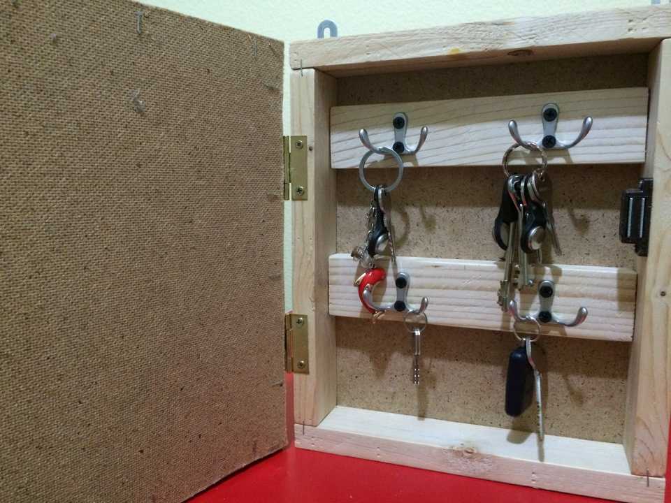 - Закрытые. Такие сделать сложнее – потребуется некоторое столярное мастерство. Представляют собой шкафчик, который закрывается дверцей. Дверцу придется навешивать на петлях, иначе она быстро отвалится. Позволяют скрыть, что именно находится внутри, оберегают ключи от чужих взглядов. В них можно встраивать полочки для полезных мелочей, повесить на дверцу зеркальце и по-другому расширить практическое применение.