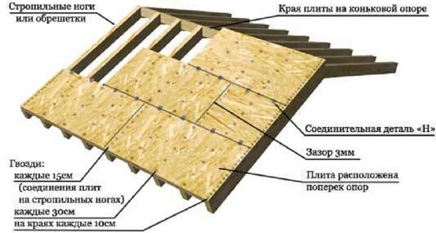 При использовании листов ФСФ их закрепление на стропилах выполняется при помощи саморезов или гвоздей, с шагом в 150 мм. Чтобы подобрать подходящую длину крепежных элементов нужно воспользоваться следующей формулой: