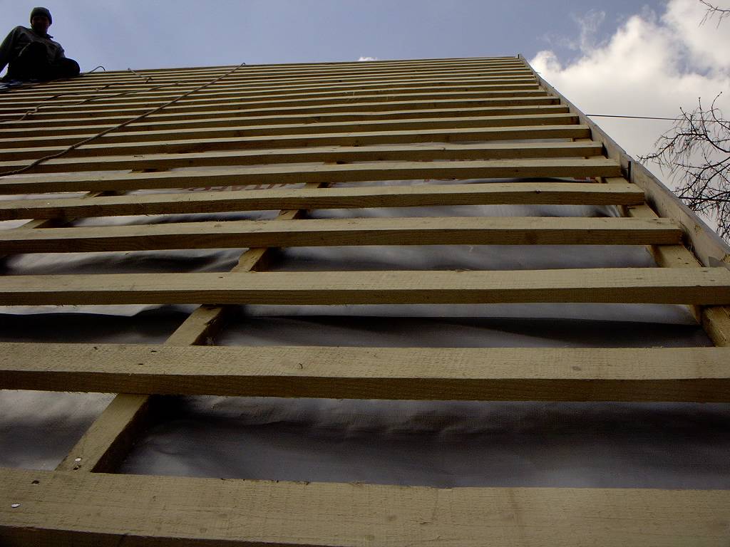 - технология предусматривает устройство сплошной обрешетки своими руками, что сильно увеличивает расход древесины (основные затраты при возведении кровли идут именно на обрешетку), пирог кровли получается дорогим;