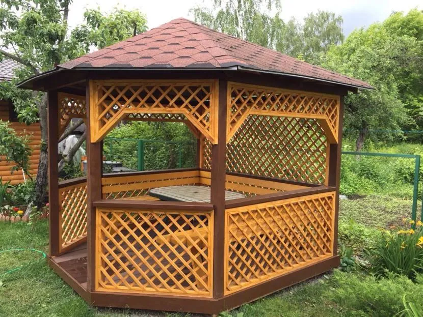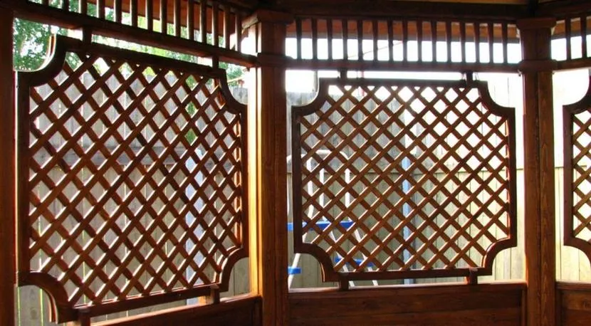 Ценят древесину и за превосходный внешний вид, благодаря которому из нее можно сделать декоративную решетку для беседки. Такой архитектурный элемент завершит экстерьер строения и придаст ему оригинальности и самобытности
