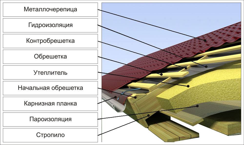 Обрешетина нужна для установки на неё обрешетки под металлочерепицу. Она прибивается на гидроизоляцию или пароизоляцию (возможны комбинирование в 2 слоя), которая в свою очередь, кладется на стропила.