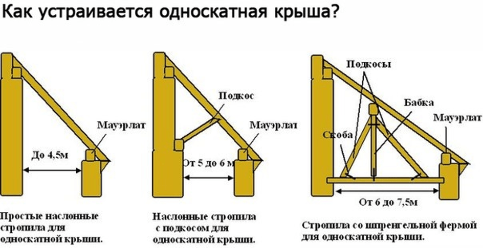 Односкатные типы стропильных конструкций чаще всего применяются для перекрытия подсобных строений: гаражей, сараев и пристроек. Как выполняются работы по сборке?