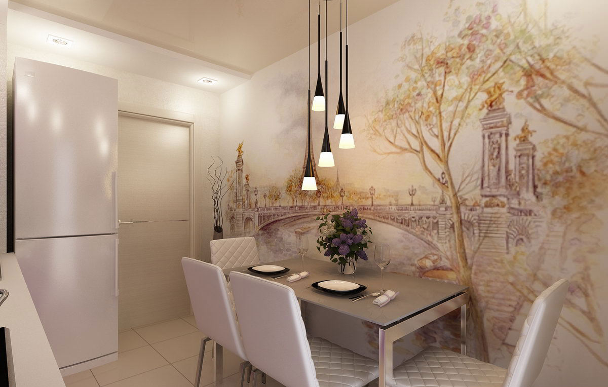 Распространённым явлением в интерьере кухни является использование фотообоев, так же подобранных под стиль кухни. Ими чаще всего оформляют столовую зону. Они отлично подходят и для оформления зон фартука, придавая дизайну определенную тематику.