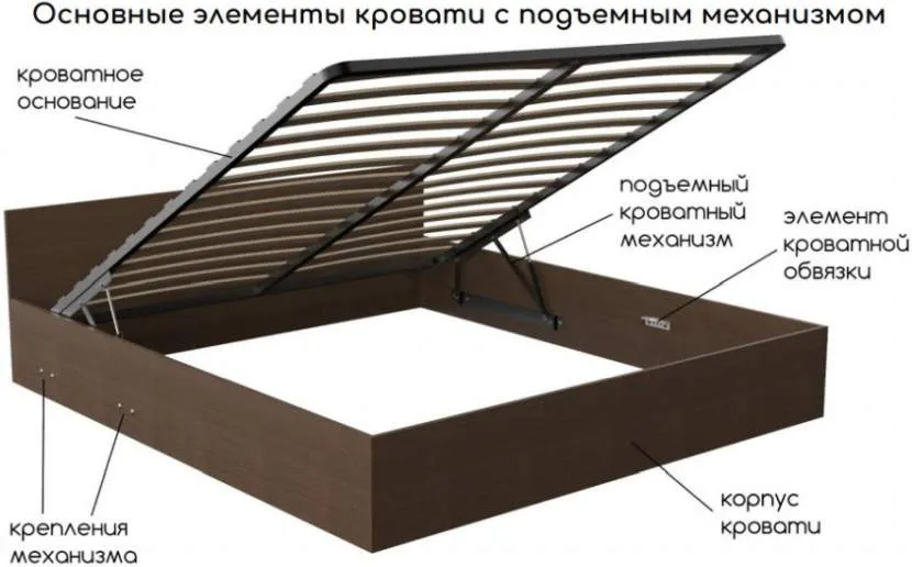 Что касается подъемного механизма кровати, то этот элемент может быть представлен в виде следующих конструкций: