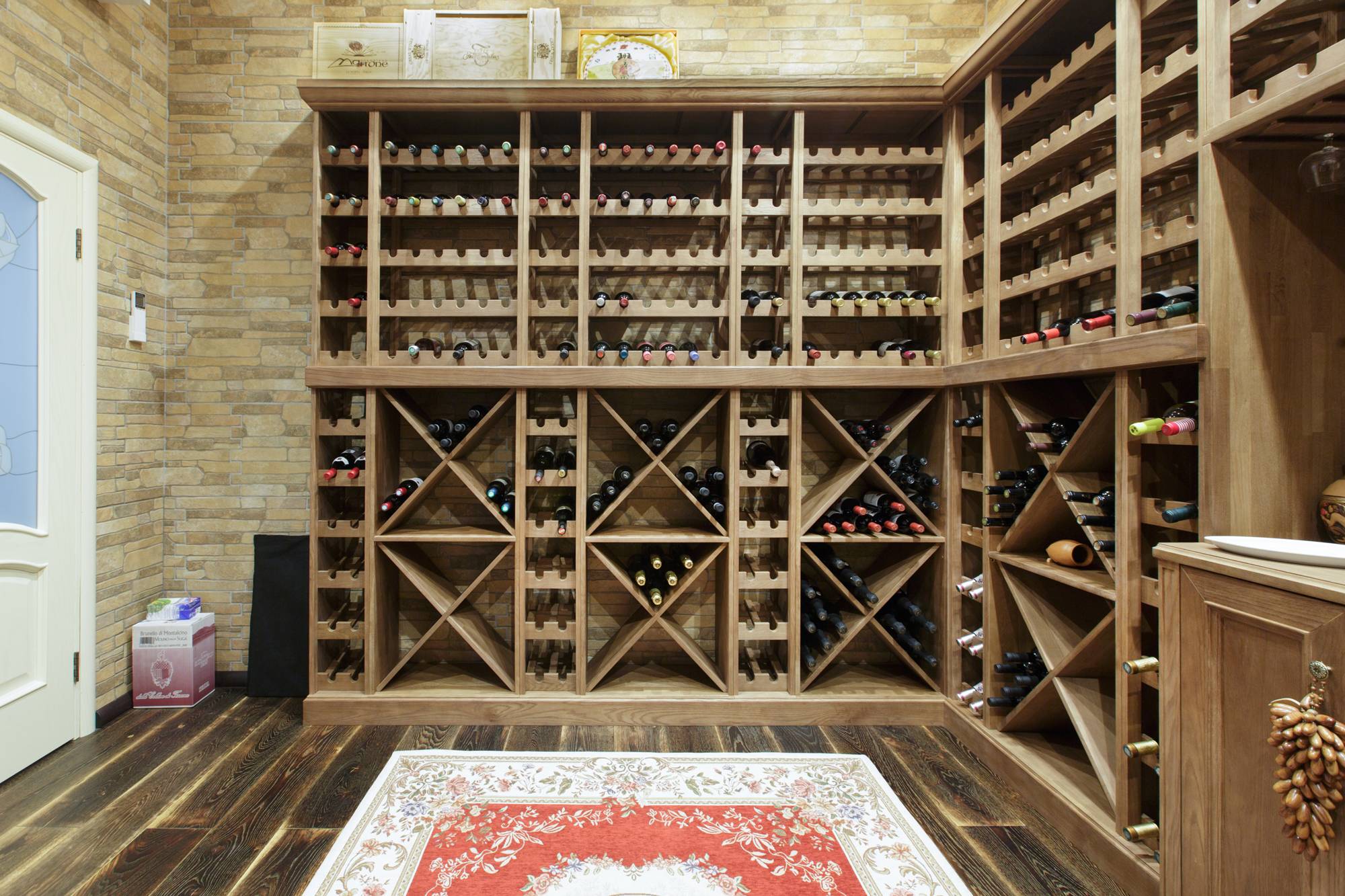 Когда бутылок в доме немалое количество, например, целая батарея или полк, можно организовать и смастерить для них целую вертикальную конструкцию от пола до потолка. Она обычно используется для установки в погребе или подвале жилого дома при достаточно низкой температуре и идеально сохраняет все вкусовые качества продукта.