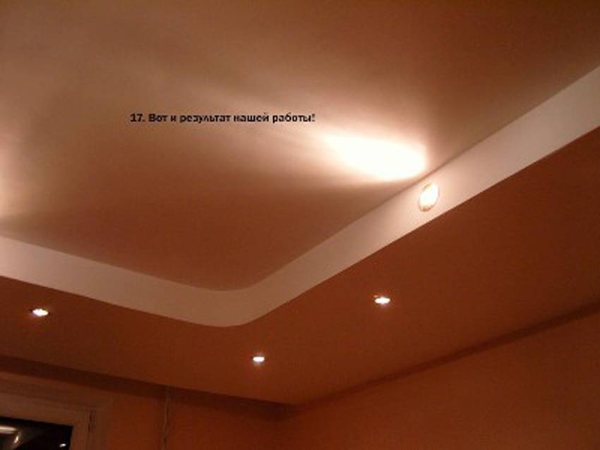 Швы первого уровня проходят черновым слоем штукатурки с применением серпянки. На этом первый этап монтажа двухуровневого потолка с подсветкой из гипсокартона завершен.
