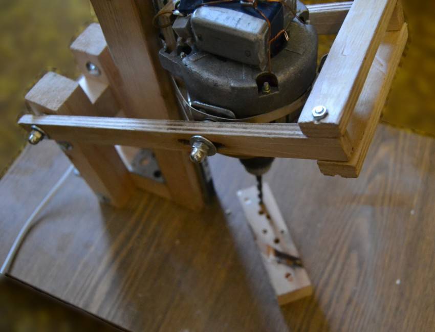 Мини сверлильный станок. Изготовление такого инструмента не отнимет много сил и времени. Данная конструкция считается наиболее экономичной, не требует большого количества материалов. Модель проектируется в зависимости от размера и формы дрели, закрепить саму дрель можно обыкновенными резиновыми жгутиками, либо кабельными стяжками.