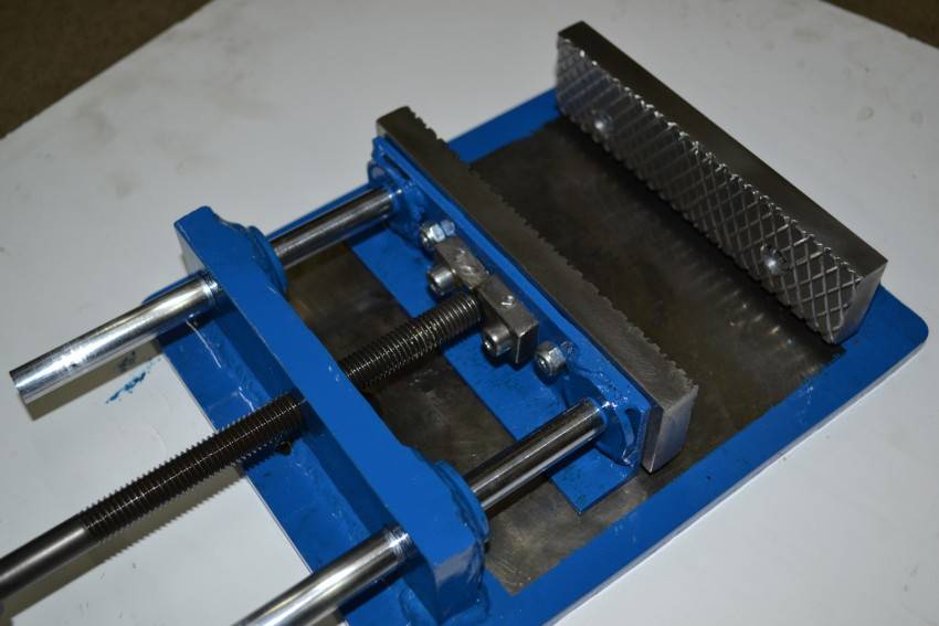 Сделать такое устройство можно самому. Главные элементы станка: двигатель, основание и катки. Электромотор опять подойдет от стиральной машинки (мощность до 300 Вт, 1,5 тыс. оборотов в минуту). Основание выпиливают из металла и сваривают, оно должно быть достаточно крепким, не шататься. Размеры рабочей столешницы примерно 16 х 18 см. В торце одной из сторон высверливаются 3 отверстия для крепления площадки с электродвигателями с помощью болтов.