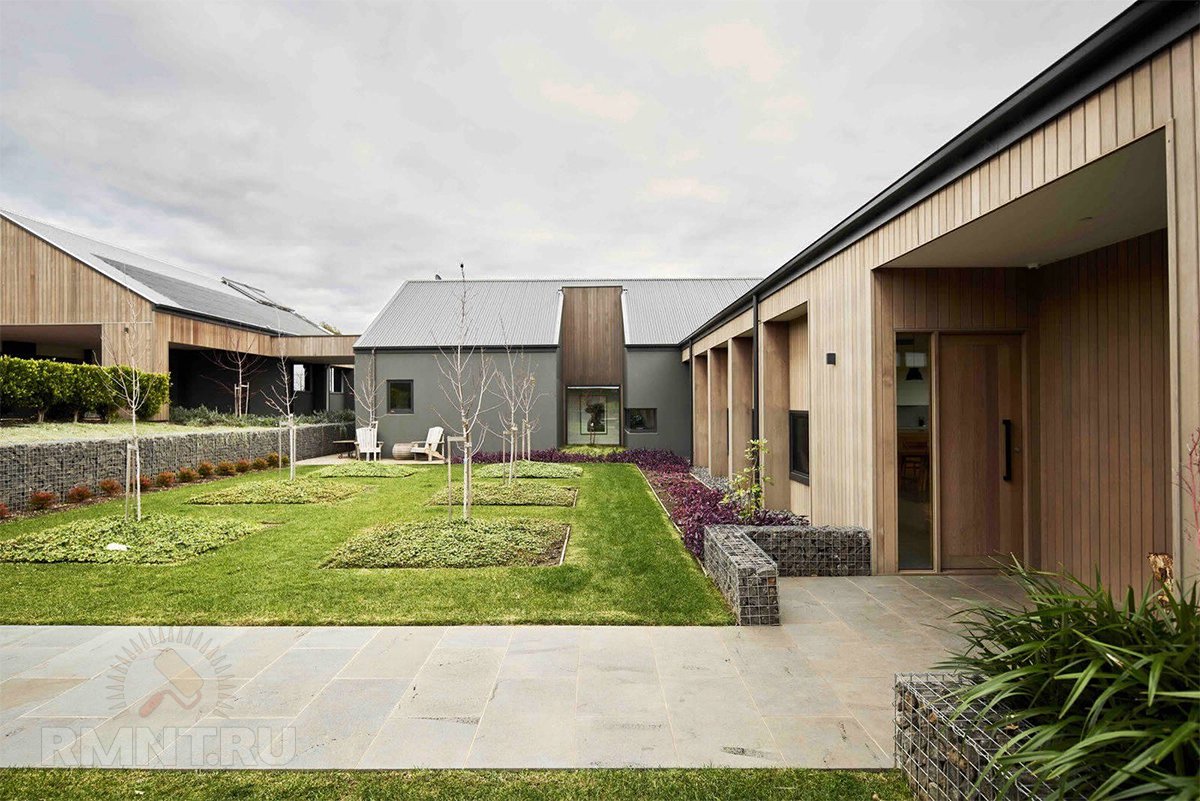 - Перед крыльцом — газон, лужайка, сзади, во внутреннем дворе — зона для барбекю .