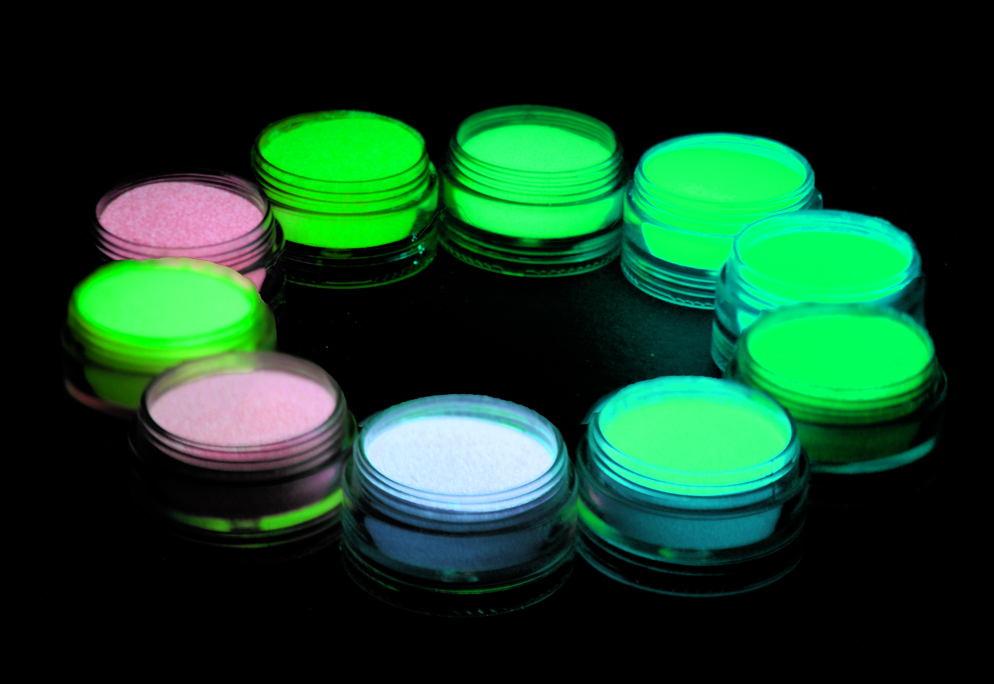 Светящиеся краски изготавливаются на акриловой основе и имеют разнообразную палитру. Люминофор без добавления цветного пигмента имеет зеленое или голубое свечение.