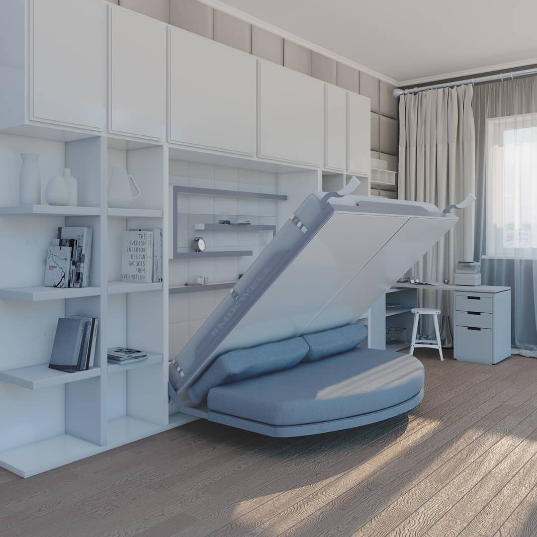 Кровать-трансформер удобна в маленьких и в больших помещениях, так как способна превратить комнату в гостиную днем, а в спальню ночью
