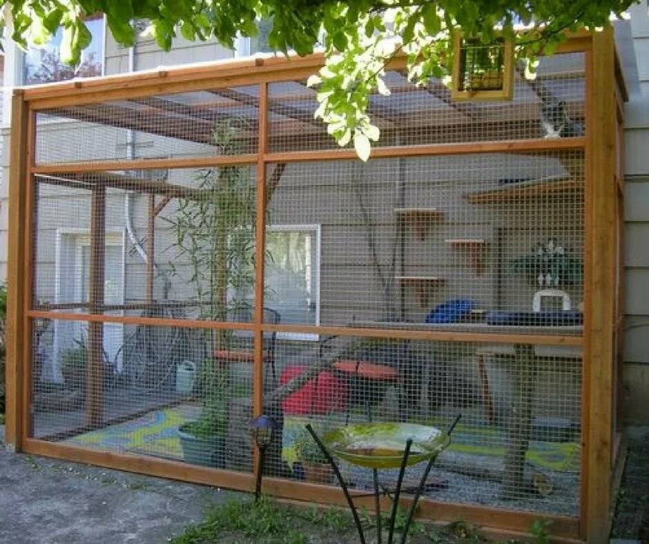 - Уличная конструкция для кошек обязательно должна иметь крышу. Она нужна не только для защиты от непогоды, но и для исключения возможности кошки перепрыгнуть через ограждение.