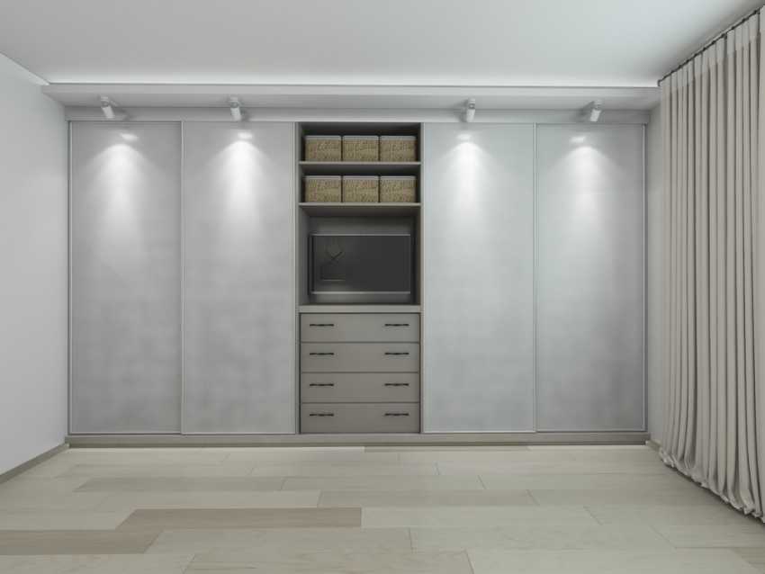 Отличительная черта встроенного шкафа-купе – отсутствие полноценного каркаса. Его дном, стенами и потолком являются ограждающие конструкции ниши. При этом в состав такой мебели входит фальшпанель в виде рамы. Она используется для крепления направляющих дверей-купе.