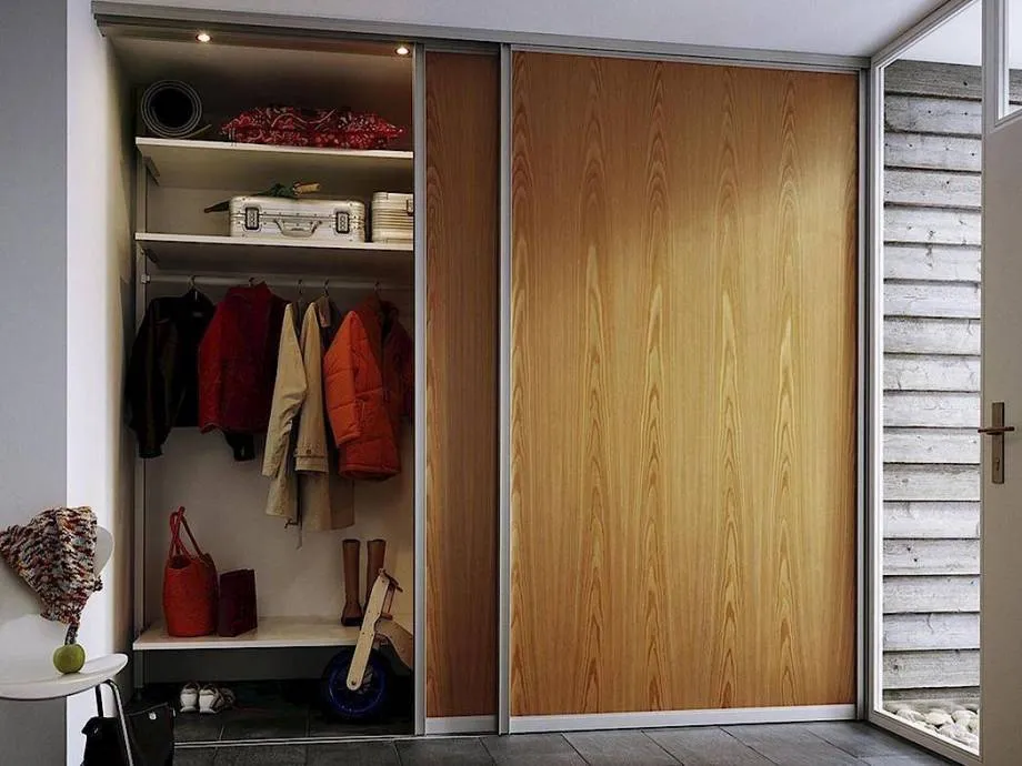 Помимо одежды за купейными дверями размещают технику, мини-кабинеты, целые гардеробные комнаты. Подобные шкафы широко используются для маскировки открытых коммуникаций, счетчиков и других изъянов постройки.