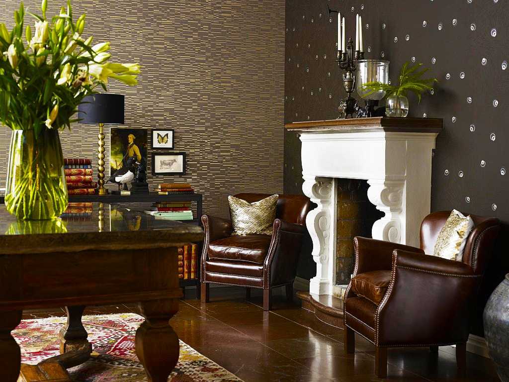 Часто предпринимаются попытки сочетать только тёмные тона. Это довольно сложно, ведь при неправильном подборе сочетаний помещение будет угнетать и не создаст необходимой атмосферы. Хорошим вариантом будет сочетание коричневого цвета с зелёным или красным. Не стоит забывать и о чёрном, который может использоваться как цвет узоров на обоях.